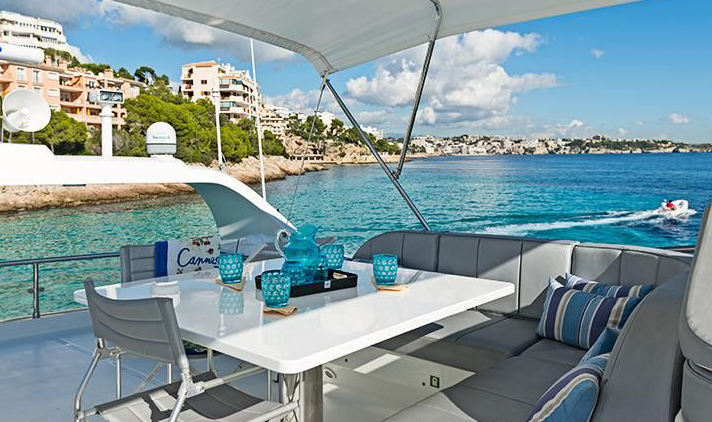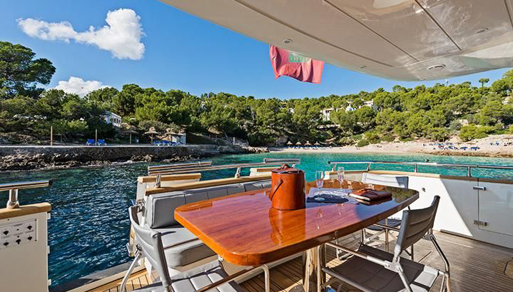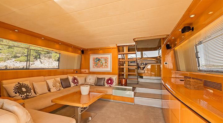 200 lb anchor with 350’ chain; 2000 Watt anchor windlass controlled from 2 stations plus local foot switch; 130 lb spare anchor; (6) s.s. cleats and fairleads; s.s. pulpit and rail (13/4”); teak caprail; teak deck; fibreglass/teak hatch to chain locker; forward sunbathing cushions with fasteners; s.s./glass hatch for crew quarters; fore deck garage with 12’ jet tender and crane; hydraulic door to the fore deck garage; s.s. rub rail on teak caprail; (2) airplane-type, heavy duty doors at the sides of deckhouse; (2) airplane-type doors at transom with rail gate for gangway and stair to platform; fibreglass swim platform with teak floor; (2) pop-out mooring winches on aft deck; hydraulic gangway with stanchions, completely retractable into the transom; s.s. swim ladder, pop-up cleats for tender on platform; mooring lines; (8) fenders; (2) boat hooks; Coast Guard safety package for 16 people; cold/hot water connections on forward deck and platform (for shower or deck wash); sea water outlets forward and aft for fire fighting (equipped with suitable hoses); anchor and chain wash system with pump; aft-deck settee with cushions and varnished table for 8 people on aft deck; (6) Metal style foldable chairs for aft deck and/or flybridge; automatic electric door to the saloon with key locking, pre-adjustment of opening (half way or full) and manual mode; s.s./tempered glass portholes; s.s./tempered-glass side windows and saloon door; storage lazarette/utility room with hatch on aft deck and direct access to engine room; (2) bulwark doors at the sides with rail gates; s.s. name on transom; canvas covers for all out; 3,4m Jet-engine Zodiac.