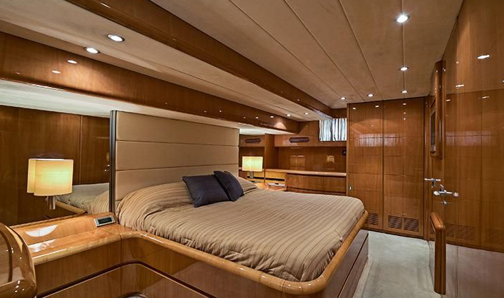 OWNER AND GUEST STATEROOMS Sleep 6 in three staterooms located forward with access down from wheelhouse. Master and VIP have king size beds, (2) nightstands, closets with drawers and automatic lights, safe. The 3rd stateroom to starboard has double French bed, nightstand, closet, and drawers. Stereo with CD player in every stateroom. Plasma Sat. TV with DVD player and VCR in master stateroom and VIP. Bang & Olufsen Telephones in all rooms.