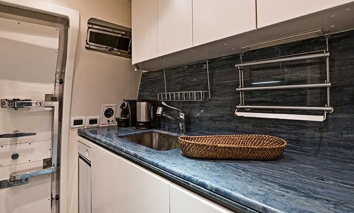 Galley up and enclosed; marble floor and counters; s.s. large sink; Miele ceramic 4-burner range; Miele conventional oven with satin s.s. front; Whirlpool microwave oven; Bosch refrigerator (1,8m hight), trash compactor; Miele dishwasher; fresh water level gauge; storage cabinets; china (66 pieces) and crystal glasses (36 pieces); marine door to main deck.
