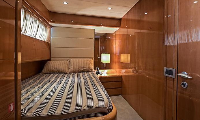 Sleep 2 in one cabin located forward with access from main deck through a stainless steel / glass hatch; two low berths, hanging rockers, and cabinets; air conditioning; (2) portholes; bathroom with stall shower; Bang & Olufsen phone; Sat. TV; VCR; stereo with CD player.