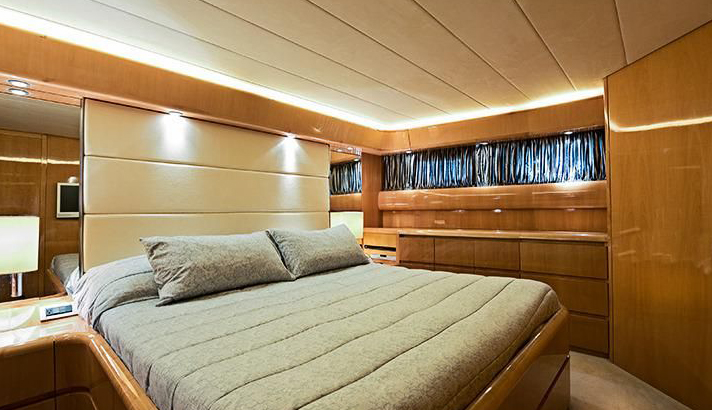 OWNER AND GUEST STATEROOMS Sleep 6 in three staterooms located forward with access down from wheelhouse. Master and VIP have king size beds, (2) nightstands, closets with drawers and automatic lights, safe. The 3rd stateroom to starboard has double French bed, nightstand, closet, and drawers. Stereo with CD player in every stateroom. Plasma Sat. TV with DVD player and VCR in master stateroom and VIP. Bang & Olufsen Telephones in all rooms.