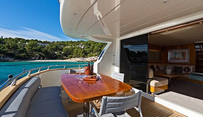 200 lb anchor with 350’ chain; 2000 Watt anchor windlass controlled from 2 stations plus local foot switch; 130 lb spare anchor; (6) s.s. cleats and fairleads; s.s. pulpit and rail (13/4”); teak caprail; teak deck; fibreglass/teak hatch to chain locker; forward sunbathing cushions with fasteners; s.s./glass hatch for crew quarters; fore deck garage with 12’ jet tender and crane; hydraulic door to the fore deck garage; s.s. rub rail on teak caprail; (2) airplane-type, heavy duty doors at the sides of deckhouse; (2) airplane-type doors at transom with rail gate for gangway and stair to platform; fibreglass swim platform with teak floor; (2) pop-out mooring winches on aft deck; hydraulic gangway with stanchions, completely retractable into the transom; s.s. swim ladder, pop-up cleats for tender on platform; mooring lines; (8) fenders; (2) boat hooks; Coast Guard safety package for 16 people; cold/hot water connections on forward deck and platform (for shower or deck wash); sea water outlets forward and aft for fire fighting (equipped with suitable hoses); anchor and chain wash system with pump; aft-deck settee with cushions and varnished table for 8 people on aft deck; (6) Metal style foldable chairs for aft deck and/or flybridge; automatic electric door to the saloon with key locking, pre-adjustment of opening (half way or full) and manual mode; s.s./tempered glass portholes; s.s./tempered-glass side windows and saloon door; storage lazarette/utility room with hatch on aft deck and direct access to engine room; (2) bulwark doors at the sides with rail gates; s.s. name on transom; canvas covers for all out; 3,4m Jet-engine Zodiac.