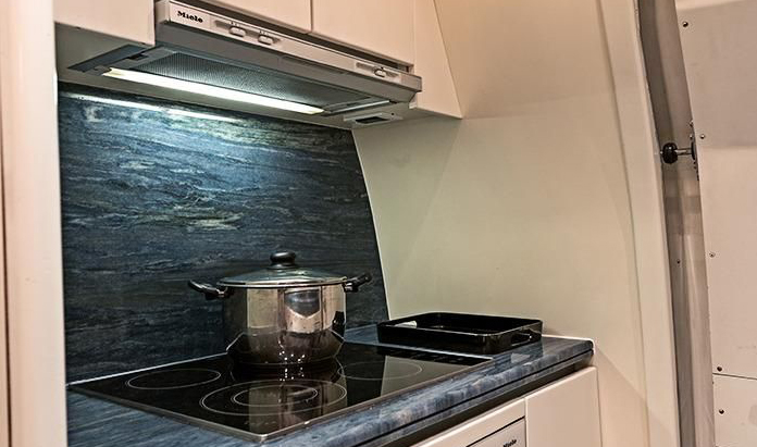 Galley up and enclosed; marble floor and counters; s.s. large sink; Miele ceramic 4-burner range; Miele conventional oven with satin s.s. front; Whirlpool microwave oven; Bosch refrigerator (1,8m hight), trash compactor; Miele dishwasher; fresh water level gauge; storage cabinets; china (66 pieces) and crystal glasses (36 pieces); marine door to main deck.